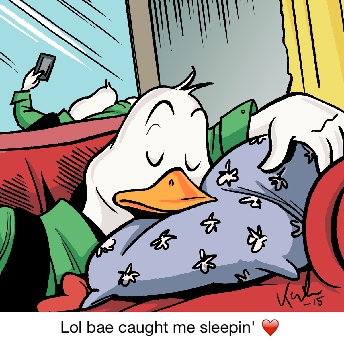 Duck family portrait dedicated to the master, Carl Barks! The illustration is compiled from close-up shots of the ducks from an old Donald Duck cover, where I filled out the gaps (see below). Carl himself is included in the drawing based on one of his self portraits. Medium: Digital brushes and photoshop.